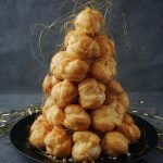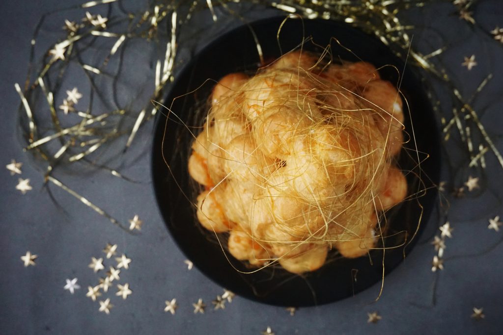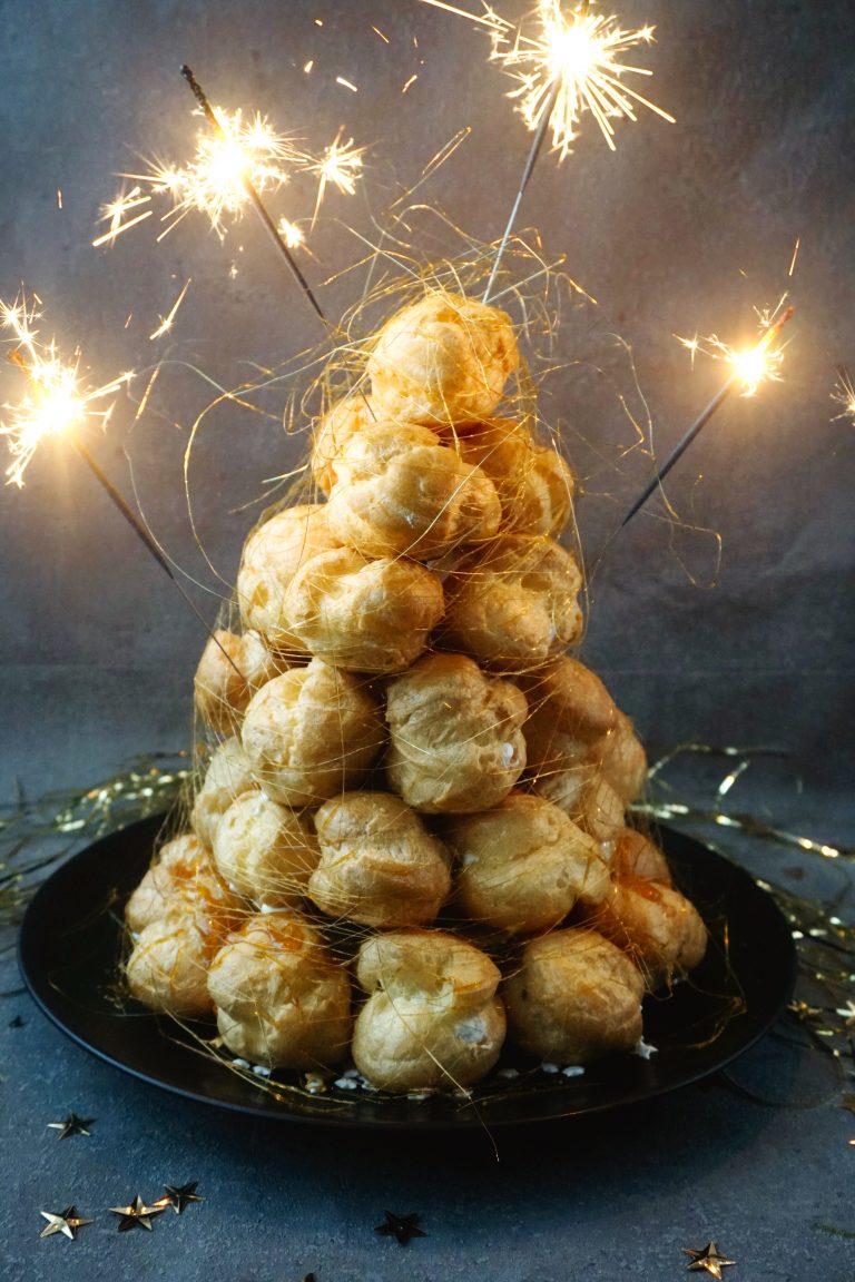 Ich bin vor einigen Jahren auf dieses Gebäck gestoßen, als ich nach einem Hingucker für unsere Silvesterfeier gesucht habe. Durch die feinen Karamellfäden bekommt dieser Windbeutelturm das gewisse Etwas. Und auch geschmacklich ergänzt sich das knusprige Karamell perfekt mit der frischen Quark-Sahne-Creme.