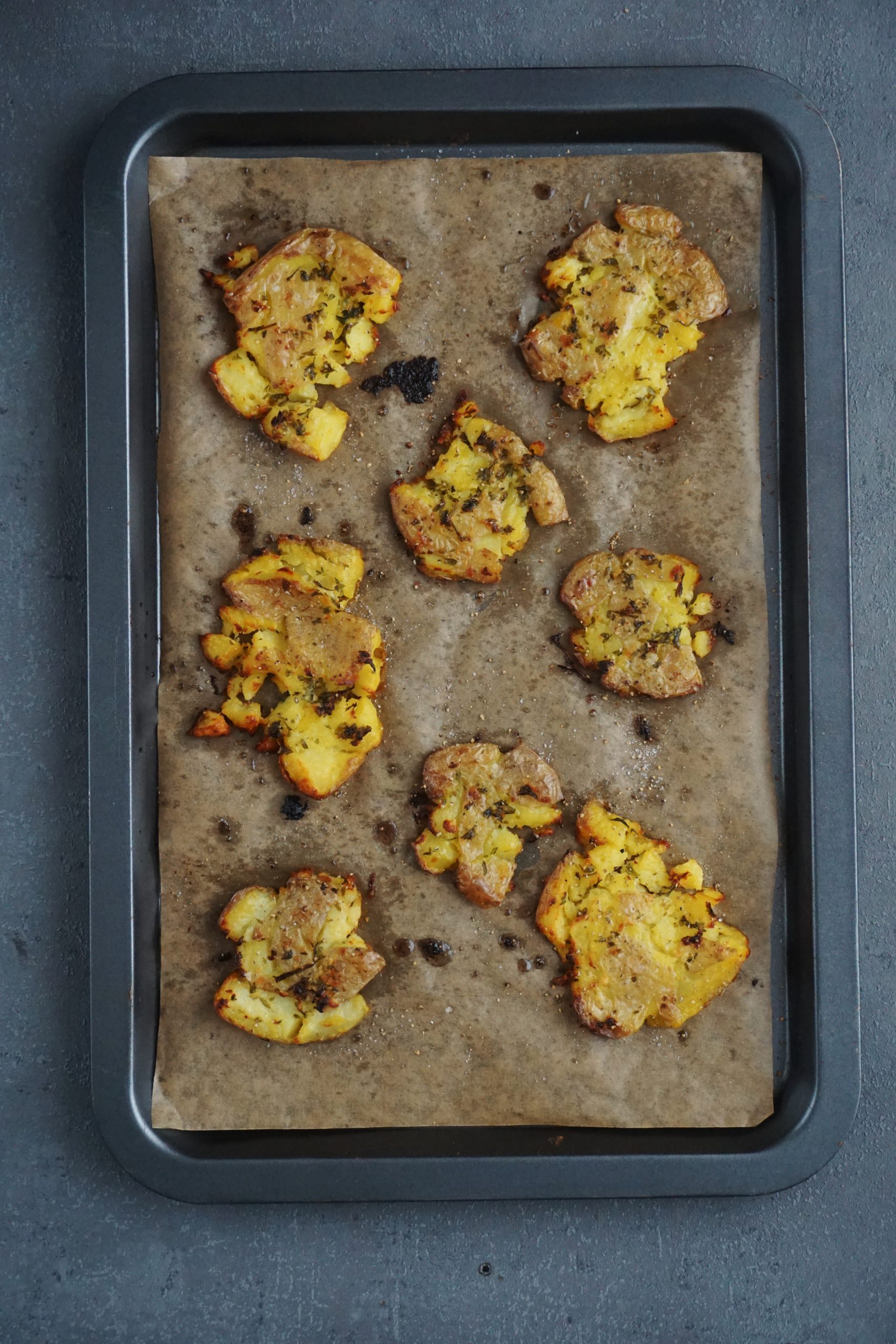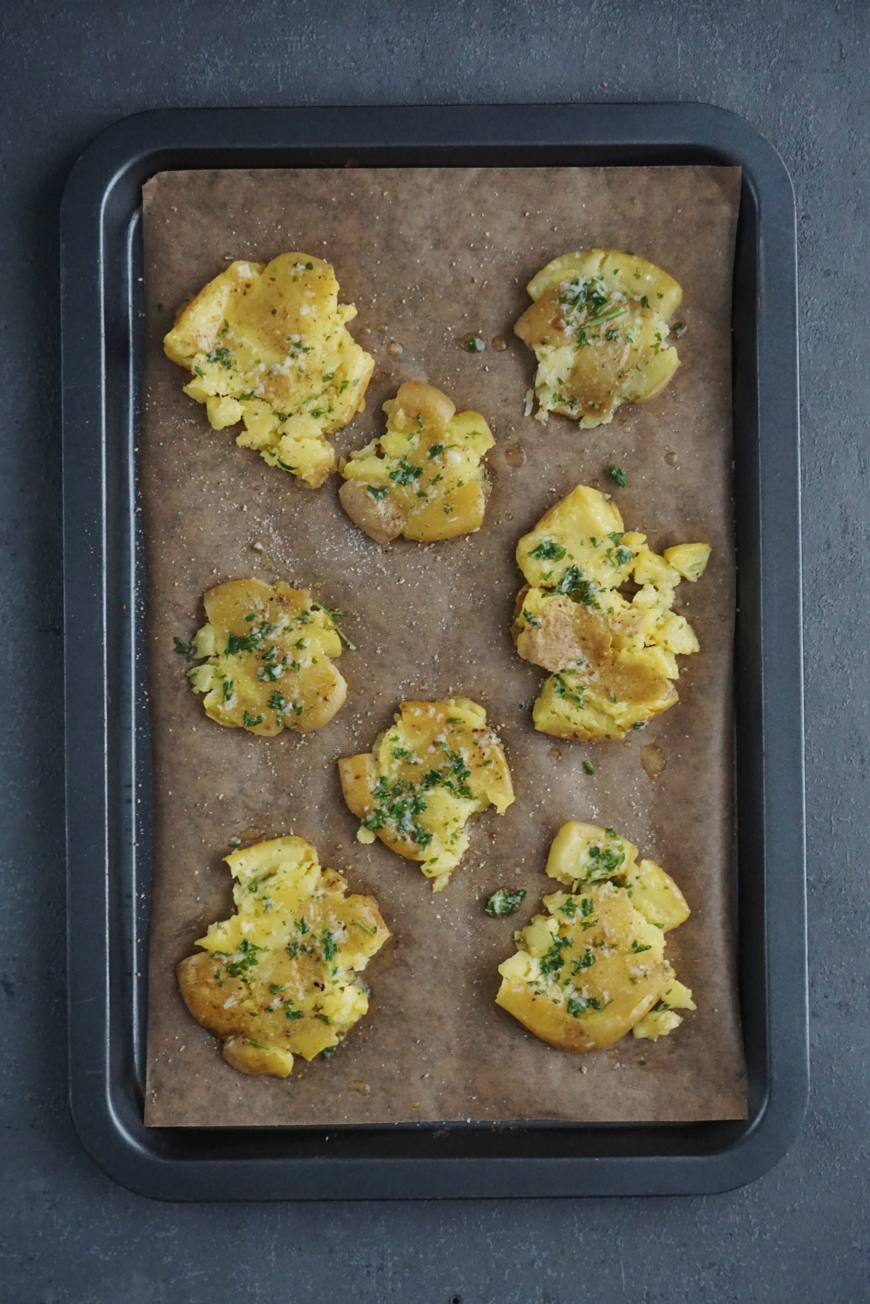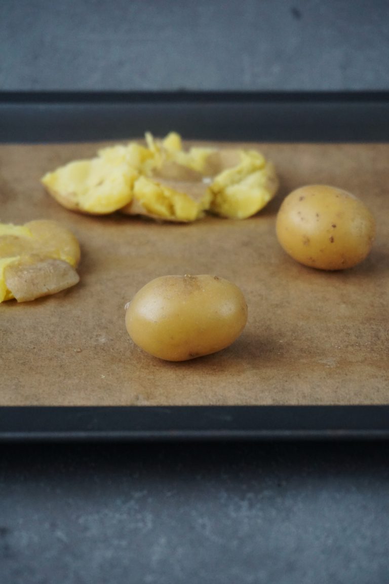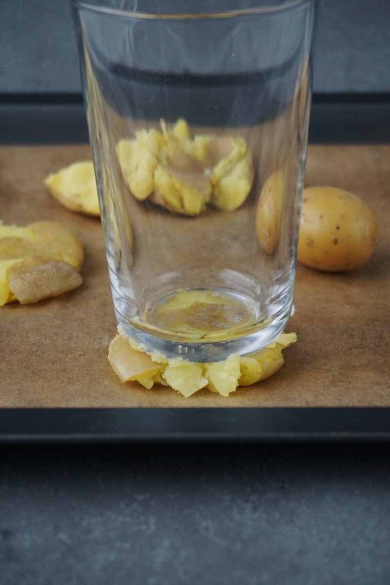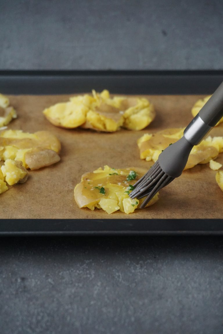 Dieses Rezept eignet sich hervorragend zum Vorbereiten oder Reste verwerten. Dazu einfach die vorgekochten Kartoffeln im Kühlschrank aufbewahren. Sie sind so etwa drei bis vier Tage haltbar. Vor dem Essen dann die Kartoffeln auf das Backblech legen, quetschen und mit der Butter bestreichen. Das ganze dauert nur 25 Minuten und ihr könnt euch in der Zwischenzeit um andere Dinge kümmern.