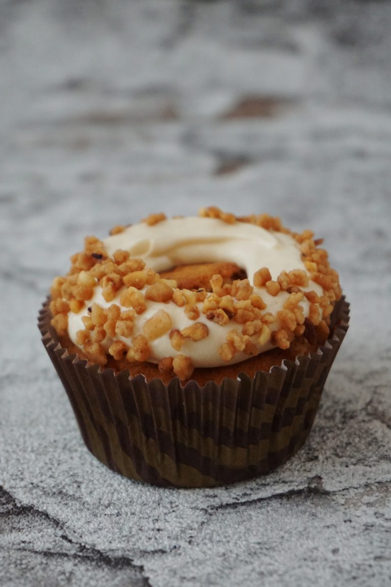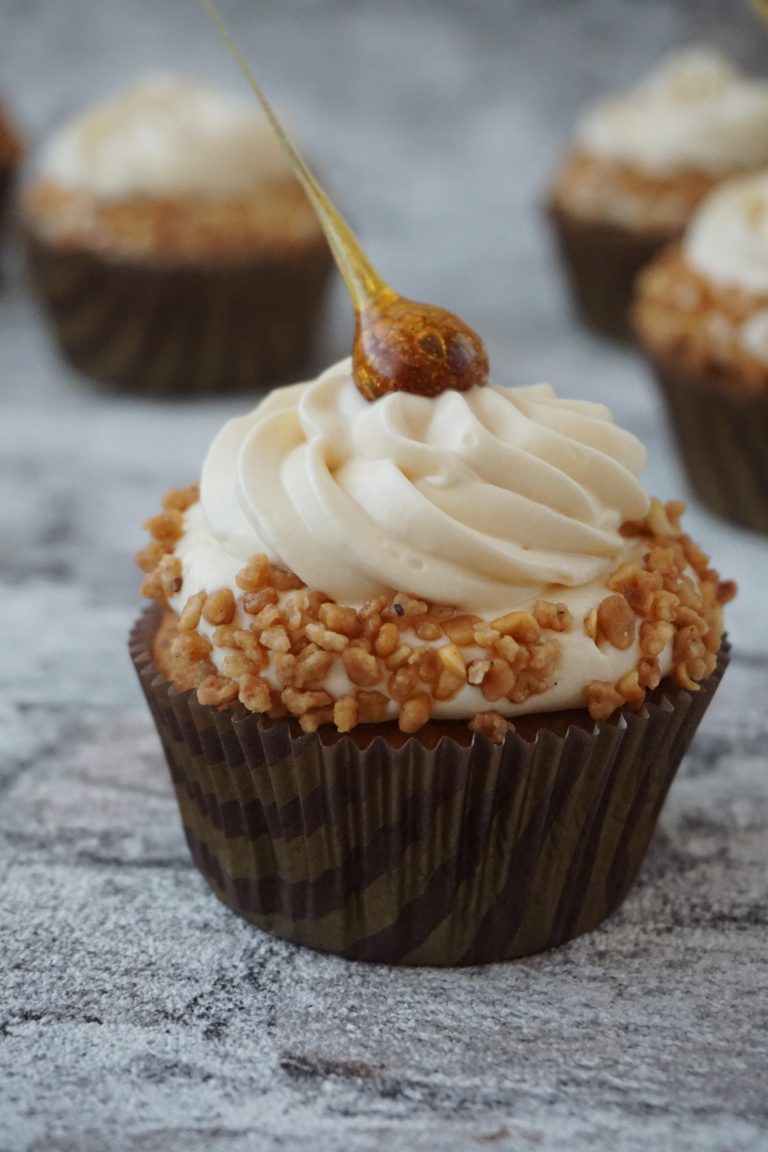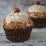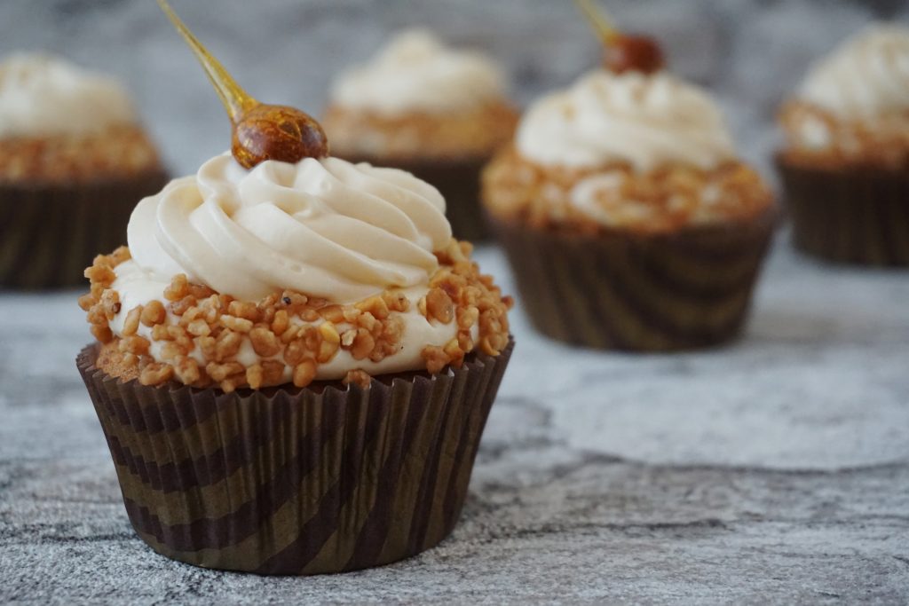 Die karamellisierten Haselnüsse erst kurz vor dem Servieren auf den Cupcake setzen, da das Karamell sonst durch die Feuchtigkeit der Creme verläuft.
