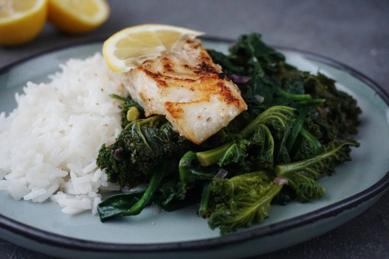 Diese an den vietnamesischen Wasserspinat angelehnte Rezept bietet, gerade in der Kombination mit dem sehr mageren Kabeljau, eine leichtere Alternative zum klassischen Grünkohlrezept.