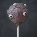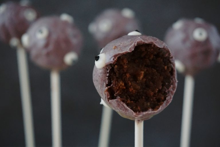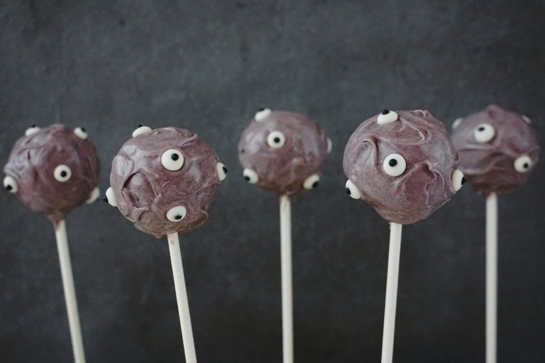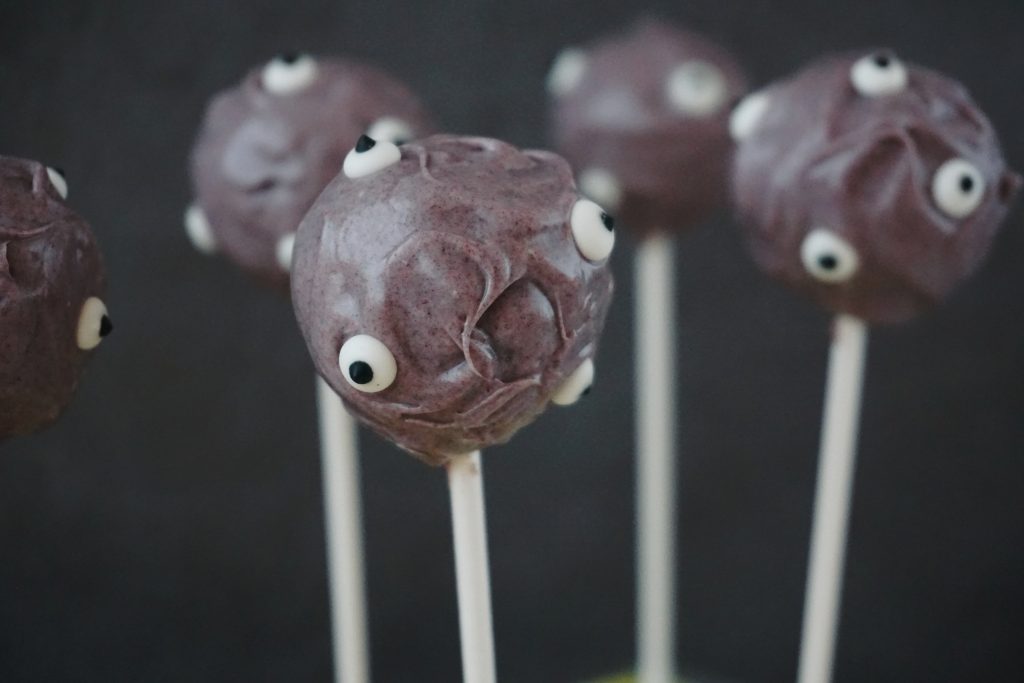 • Die gekühlten Cakepops in die Schokolade tauchen und kopfüber abtropfen lassen. Sobald keine Schokolade mehr abtropft, umdrehen und mit einem Teelöffel nochmal über den Cakepop streichen um die Struktur zu erzeugen. Direkt die Augen aufsetzen und in den Ständer stellen. Bis zum Verzehr im Kühlschrank aufbewahren.